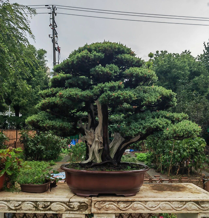 随后,调研团前往吴中区杨贵生先生的“遂苑”盆景园进行走访。该园主要培育黑松、赤松、黄山松、五叶松、大阪松、真柏、侧柏、龙柏等松柏类盆景,以及金弹子、榔榆等大型盆景。杨贵生作为盆景名家,在盆景制作方面精艺求精、技艺精湛,其经手打理的盆景虬枝盘曲、气韵生动、苍劲挺拔。调研团成员听取了杨贵生关于盆景制作与养护管理经验的介绍,并就盆景修剪、蟠扎、摘心、舍利干制作、病虫害防治等技艺进行了现场交流。