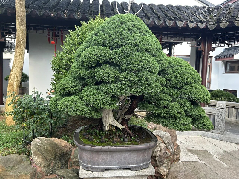 最后,调研团来到姑苏区蔡长春先生的“姑苏人家”盆景园进行考察。该园小巧精致,黄杨、罗汉松、桧柏、刺柏等盆景错落有致地摆放在庭院中,与湖石、溪流、小桥相映成趣。蔡长春先生收藏了上百盆盆景,对盆景养护及鉴赏有独到的见解,他分享了其庭院养护盆景的经验和体会,调研团成员就推动盆景融入百姓日常生活以及盆景市场发展趋势等内容进行了探讨。